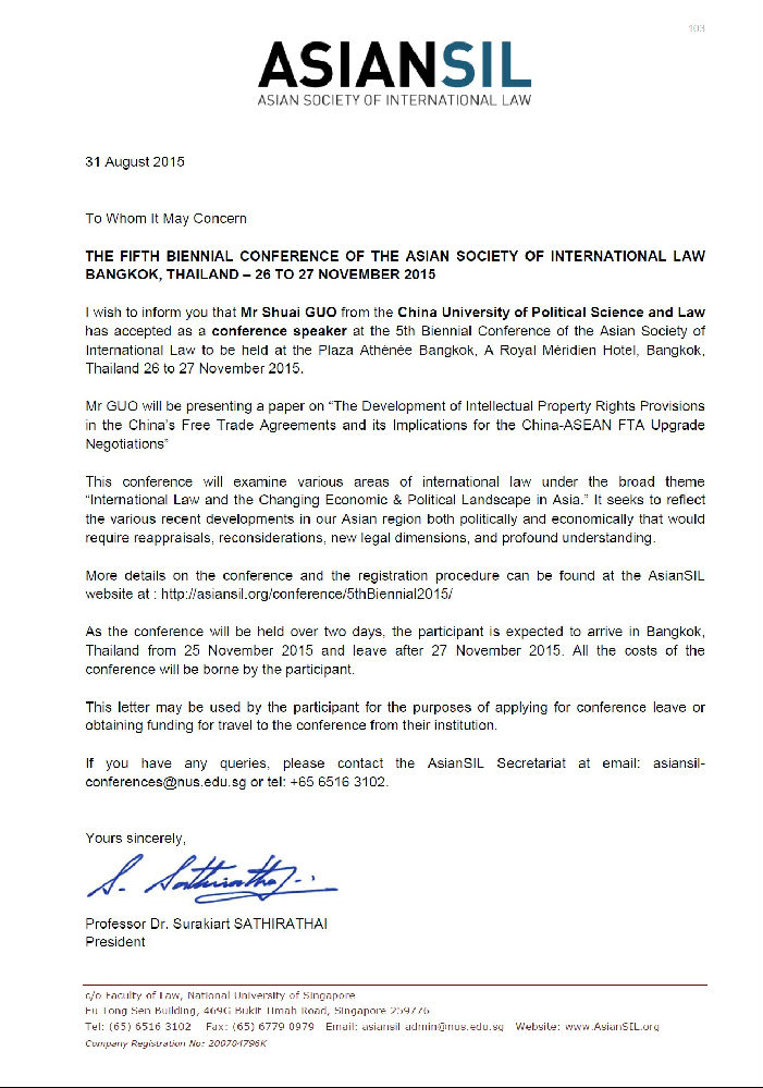 研究生郭帅参加第五届双年会(5th Biennial Conference of the Asian Society of International Law),并做题为《中国自由贸易协定中知识产权条款的发展及对中国-东盟自由贸易区升级谈判的启示》(”The Development ofIntellectual Property Rights Provisions in the China’s Free Trade Agreementsand its Implications for the China-ASEAN FTA Upgrade Negotiations”)的英文报告。