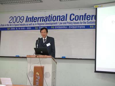教师覃华平博士于2009年10月16日参加了由韩国航空大学校和韩国航空与空间法学会主办的第四十三届航空与空间法国际研讨会。宣增益教授应邀在会上就“中国航空法面临的挑战与改革”作了主题发言,发言引起了与会者的广泛讨论。覃华平博士作为评论小组成员就与会者的发言发表了评论。会议结束以后,宣增益教授于10月17日下午还应邀给韩国航空大学校的研究生和教师做了题为“21世纪中国航空法面临的挑战和改革”的专题演讲,受到了学生的广泛好评。