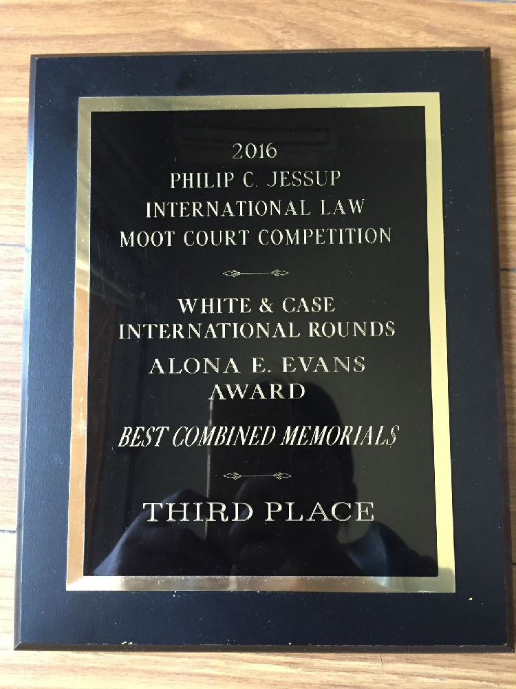 代表队从来自世界90多个国家和地区的132支队伍中脱颖而出,获得“诉状总成绩世界季军”(Alona E. Evans奖世界季军)。这是中国大陆各大院校在该项比赛所取得的书状最好成绩。