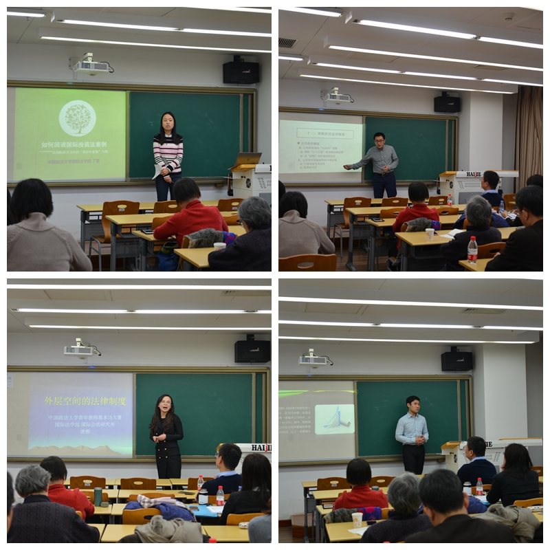 第一位上台的教师是薛童老师,他就国际私法理论中的公共秩序保留问题进行了阐述,条理清晰、简单易懂。接着,丁夏老师就“如何阅读国际投资法案例”为主题,结合保护伞条款娓娓道来。之后,唐雅老师围绕着空间制度,将国际空间法的历史、空间的划分以及外层空间责任制度一一展现在我们面前。最后一位演讲者是李伯轩老师,他以船舶碰撞责任的概念和构成要件为中心,结合案例,详细展示了船舶碰撞与承担责任的法律基础。