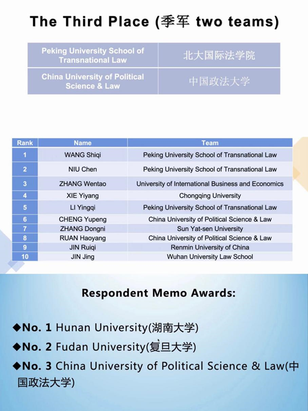 兰花副教授的指导下,从法律问题、文书写作到口头表达等多方面进行了高强度的持续训练与充分准备。在淘汰赛和晋级赛等一系列激烈而有挑战的比赛中,展现出了法大国际法模拟法庭赛队的专业素养和傲人风采。