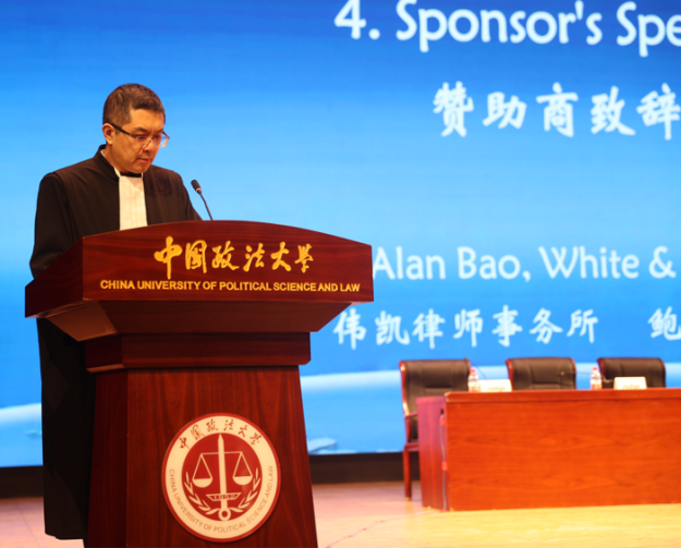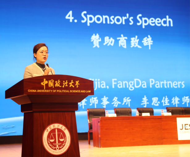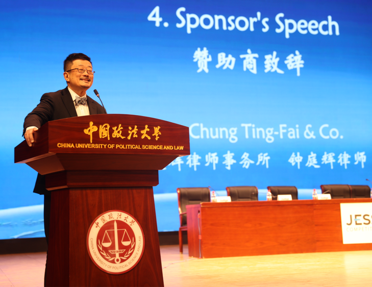 此次赛事的各赞助商致辞表达对赛事成功举办的祝贺。方达律师事务所(FANGDA PARTNERS)、伟凯律师事务所(White&Case LLP)、贝克·麦坚时律师事务所(Baker&McKenzie)、高伟绅律师事务所(Clifford Chance LLP)、钟庭辉律师事务所(Chung Ting Fai&Co)的代表发表致辞,代表们表达了对“杰赛普”赛事不仅是法律专业学生展示才华和成就的平台,还对国际法的发展和实践也有很大贡献的肯定;传达了对选手们在法律之路上珍视团队精神、保持自信并锤炼法律技能的希冀;相信晋级国际赛的赛队旅程不会止步于华盛顿,无论参赛选手以后致力于何领域,“杰赛普”的经历都会使其终身受益。
