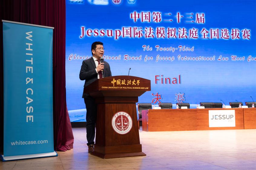 副校长刘艳红教授表示,作为中国法学教育的重镇,法大始终以厚德、明法、格物、致公为校训,致力于培养具有国际视野,通晓国际法规则的高素质法治人才。近年来,学校高度重视涉外法治建设,大力推动国际法学科的发展,积极搭建国际交流平台,鼓励师生参与国际赛事。在多个国际法模拟法庭竞赛中,法大学子屡创佳绩,充分展现了卓越的专业素养与责任担当。她认为,这不仅是一场知识与技能的较量,更是一次法治精神与国际法视野的较量和碰撞。作为主办方深感荣幸,能够为此盛事贡献力量,也特别期待未来与各位兄弟院校携手共进,一起推动中国国际法实践教育迈向更高的台阶。她强调,无论比赛结果如何,各参赛队伍对国际法的热忱与投入都值得喝彩。同时,她也热烈祝贺晋级前九名的优秀队伍,愿其代表中国赛区出征华盛顿国际赛事,勇攀高峰,载誉而归,在国际舞台上展现中国国际法青年的风采。刘艳红教授希望杰赛普精神薪火相传,每一位青年学子在国际法的道路上砥砺前行,在座的每一位师生以及赞助单位都为中国涉外法治人才的培养添砖加瓦,为构建人类命运共同体贡献智慧与力量。
