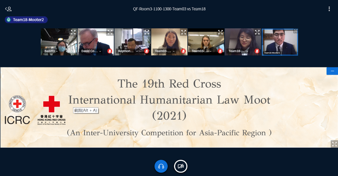 第19届亚太区红十字国际人道法模拟法庭比赛是由香港红十字会及红十字国际委员会联合主办,香港大学法律学院及香港中文大学法律学院协办的以英文为工作语言的国际人道法模拟法庭竞赛,旨在促进国际人道法在亚太地区的传播,是亚太地区影响最大的国际人道法模拟法庭竞赛。因为疫情原因,本届比赛再次采用以提交书状结合线上庭辩形式进行。近百名来自亚太区各个著名大学的法学菁英云集于此,26支参赛队伍就复杂的武装冲突中作战手段的合法性、受保护者的地位认定以及种族灭绝罪为焦点展开辩论。其中大多数赛队出自英语为官方语言或母语的国家,实力不俗,竞争十分激烈。