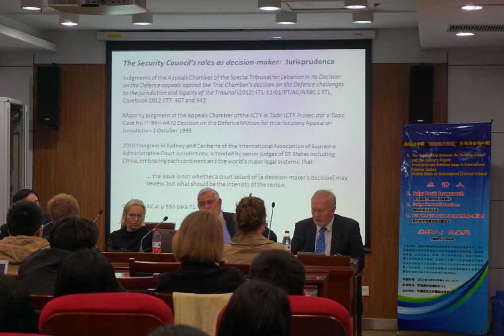 2015年3月30日晚六点半,我校国际法大讲堂系列讲座第39期在学院路校区科研楼B211举行。联合国黎巴嫩特别法庭庭长Judge David Baragwanath、国际刑事法院法官Judge Howard Morrison、联合国柬埔寨特别法庭法官Judge Agnieszka Klonowiecka-Milart为我校师生做了一场精彩的演讲。