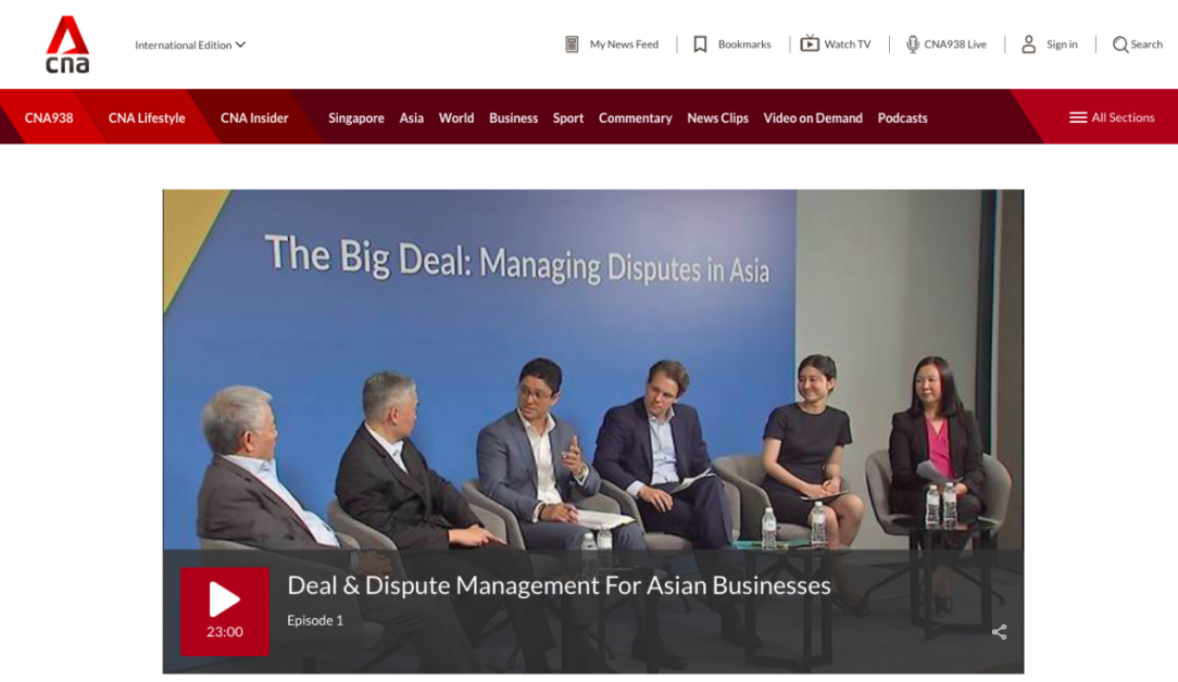 亚洲新闻电视台(CNA)专门为此次研讨会现场录制,并制作新闻纪录片《Deal & Dispute Management For Asian Businesses》(亚洲商事交易与纠纷管理)。该纪录片于2019年8月29日在亚洲新闻电视台首播。